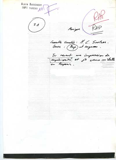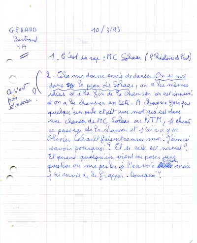 A travers les informations mises à ma disposition, ma démarche a été la suivante: dans un premier temps, j'ai collationné les divers témoignages relevés dans les questionnaireset pu établir, assez rapidement, des rapprochements entre certaines situations évoquées dans ceux-ciet les témoignages engrangés lors de mes expériences, tests d'écoute et interrogations auprès de plus de 6000 jeunes dont 4000 copies conservés précieusement depuis mon passage en collège et lycée.