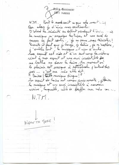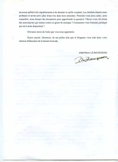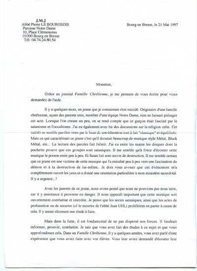 Sachez qu’il faut prendre conscience que la musique s’impose à leur esprit, comme un guide, une voie, une foi. Et particulièrement aujourd’hui avec les moyens techniques qui permettent des écoutes fréquentes, en tous lieux, à tout moment. Et quand certains jeunes « adeptes », adoptent et vivent l’idéologie satanique…ou s’identifient à quelques « sous-doués apocalyptiques » de l’expression humaine, par exemple, à travers l’expression musicale…C’est grave, c’est trop grave ! J’en connais les conséquences avec des cas très précis.