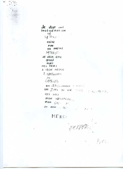 "…Je veux une incinération de SATAN faite par un prêtre SATANIQUE Je veux être brûlé avec mes trucs d’IRON MAIDEN
