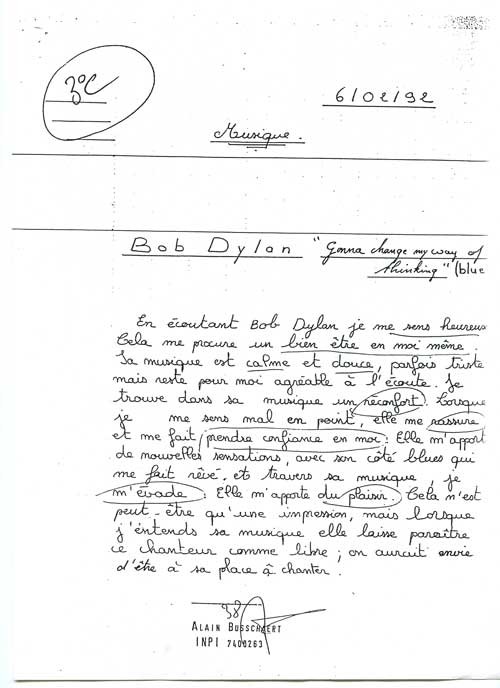 « …en écoutant Bob Dylan, je me sens heureuse cela me provoque un bien-être* en moi-même. La musique est calme et douce. Je trouve dans sa musique un réconfort. Lorsque je me sens mal en point, elle me rassure et me fait prendre confiance en moi, je m’évade, elle m’apporte du plaisir »…